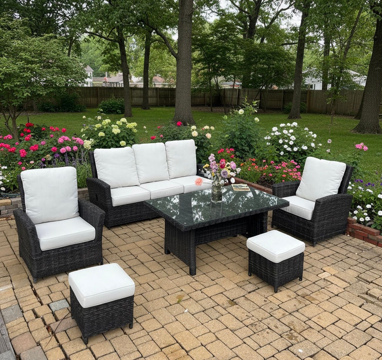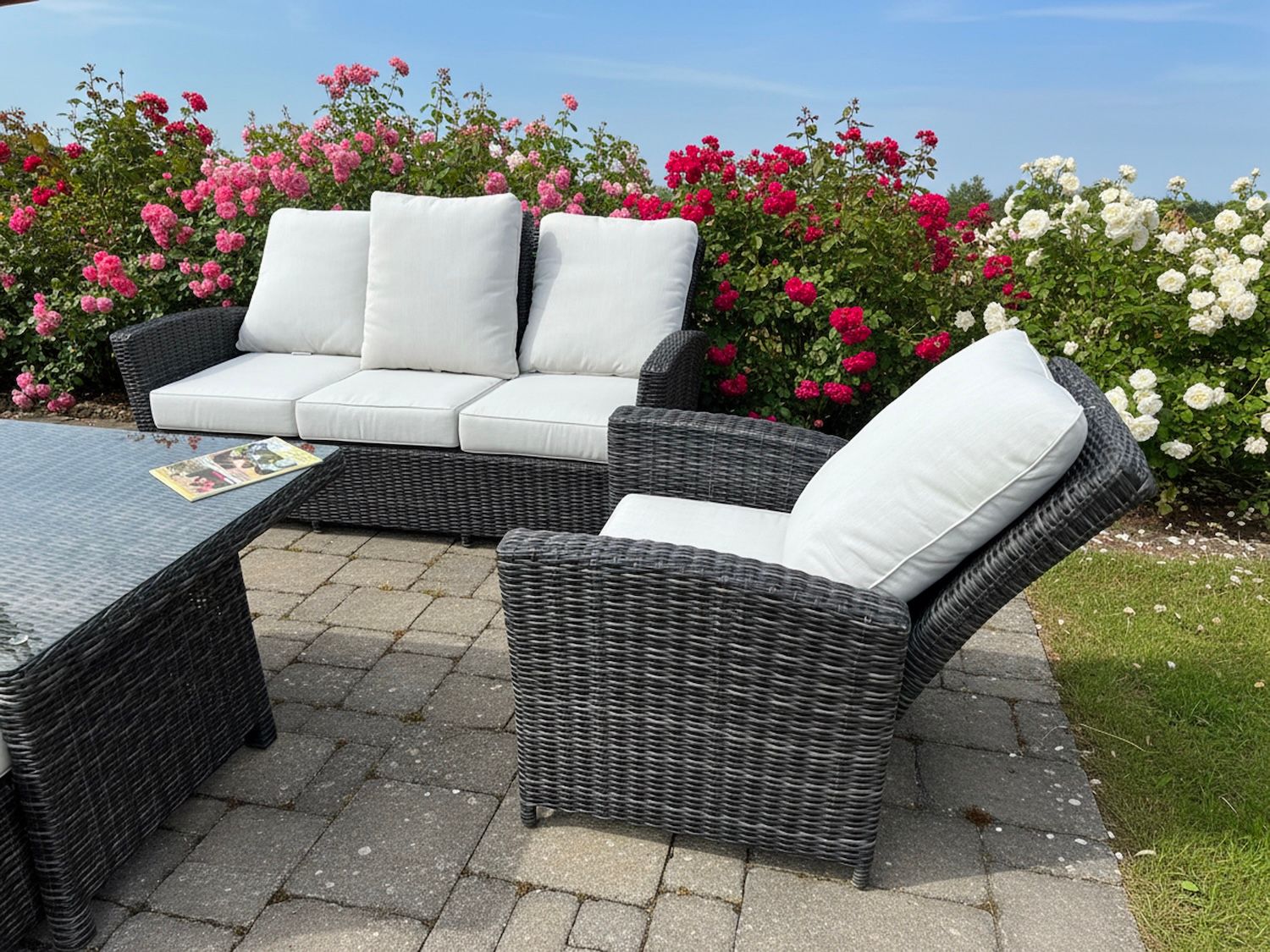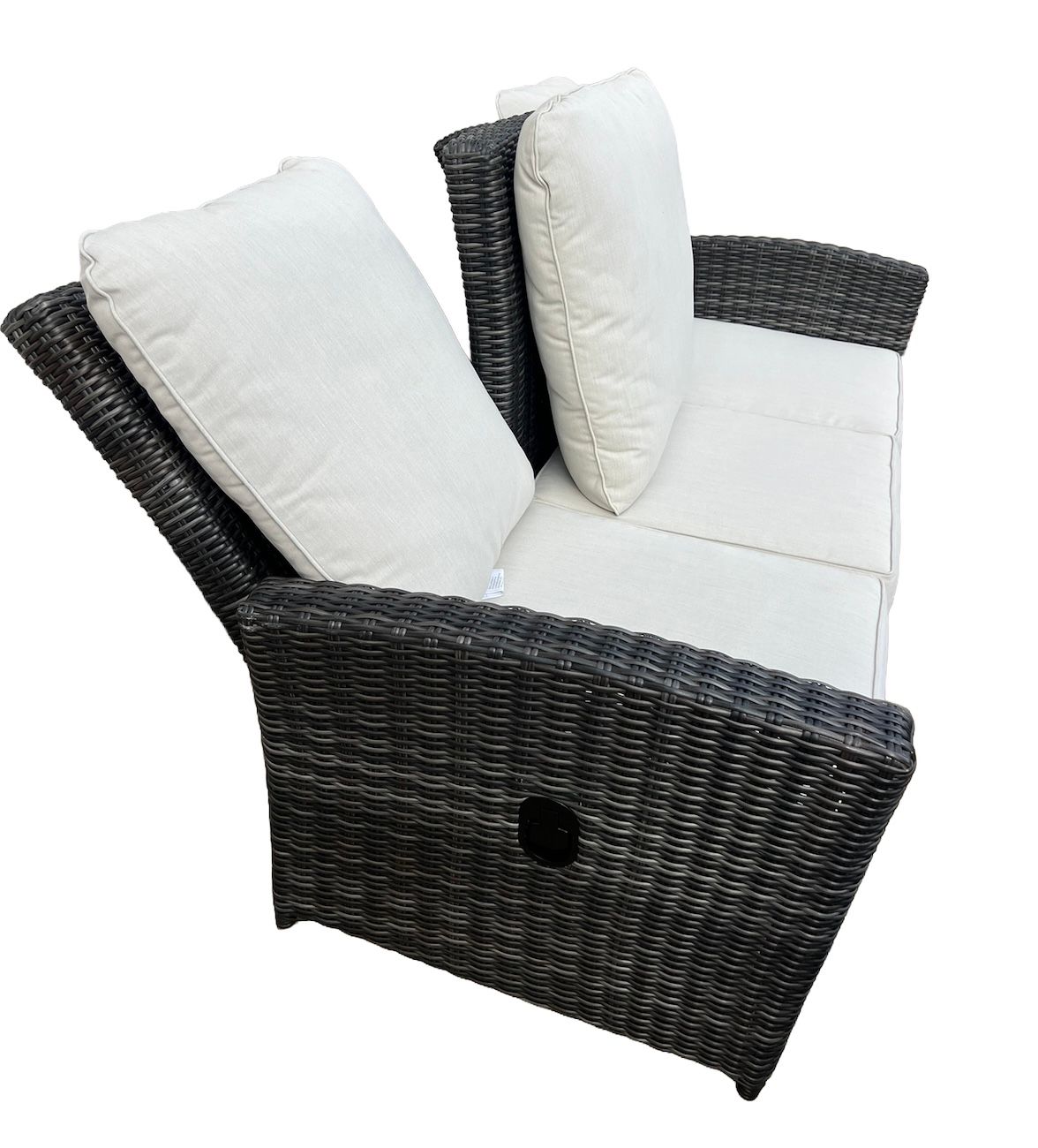 What better way to enjoy your time outside than to sit back and relax. This set features reclining backs for the ultimate comfort. These "All Weather" sets feature strong tubular aluminum frames and handwoven resin wicker. Cushions in your choice of indoor/outdoor fabrics. Sunbrella fabrics are available for an additional cost. Gray finish.