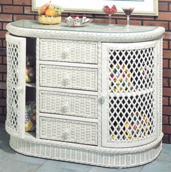 A formal serving unit that's a perfect accompaniment to your dining room. Gracefully curved lattice weave doors open to reveal two cabinets each with two storage compartments which house your serving plates and dishes. Four large drawers for your utensils and table linen. Constructed of heavy core handwoven wicker over a solid wood frame and made to fit flush against a wall. Whitewash or antique finish.