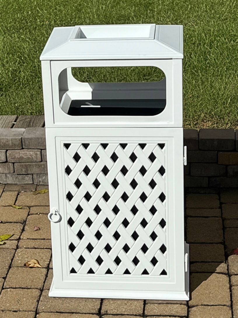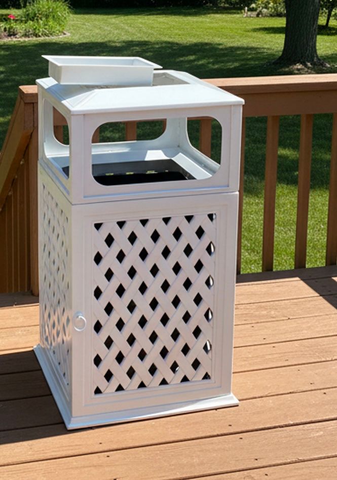 This cast aluminum can with a removable built in ashtray is a convenient way to handle designated smoking areas. Receptacle includes a removable bin for a garbage liner. Bronze or White finish.