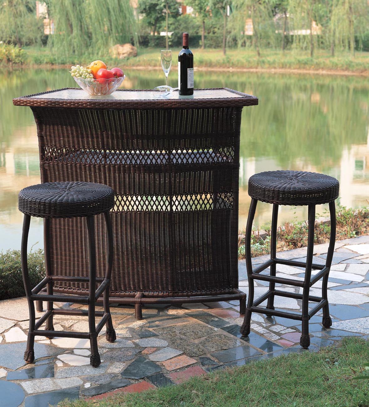 This delightful outdoor bar set works great on your patio or next to your pool. Handcrafted of "powder coated" steel frames (resist rusting) combined with handwoven "All Weather" wicker, this durable set is built for years of worry free use. The bar has two storage shelves, a top preparation shelf, a foot-rest and includes two matching handwoven stools. The modular design allows for expansion. Dark Cherry or White finish.