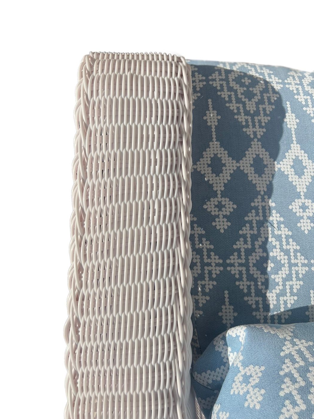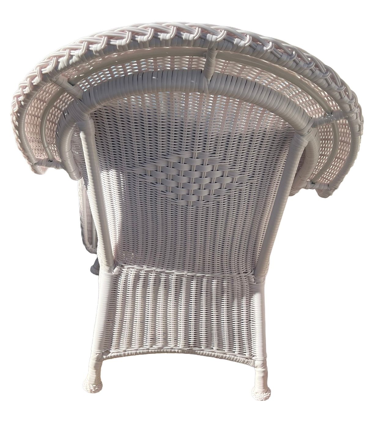 For a fine outdoor experience these matching dining sets are the perfect choice. Made of soft vinyl/resin fibers handwoven over rustproof aluminum frames. Cushions included in your choice of acrylic fabric (resists water and mildew). Sunbrella fabric available at an additional charge. White finish.