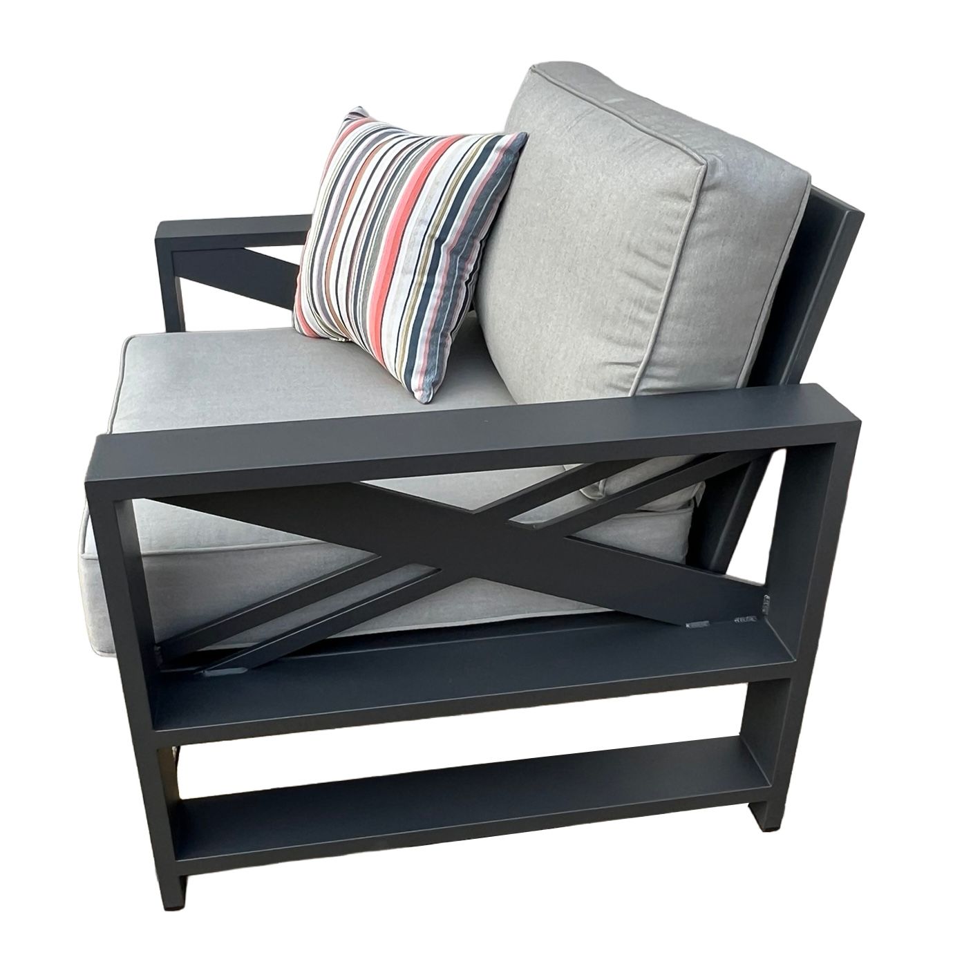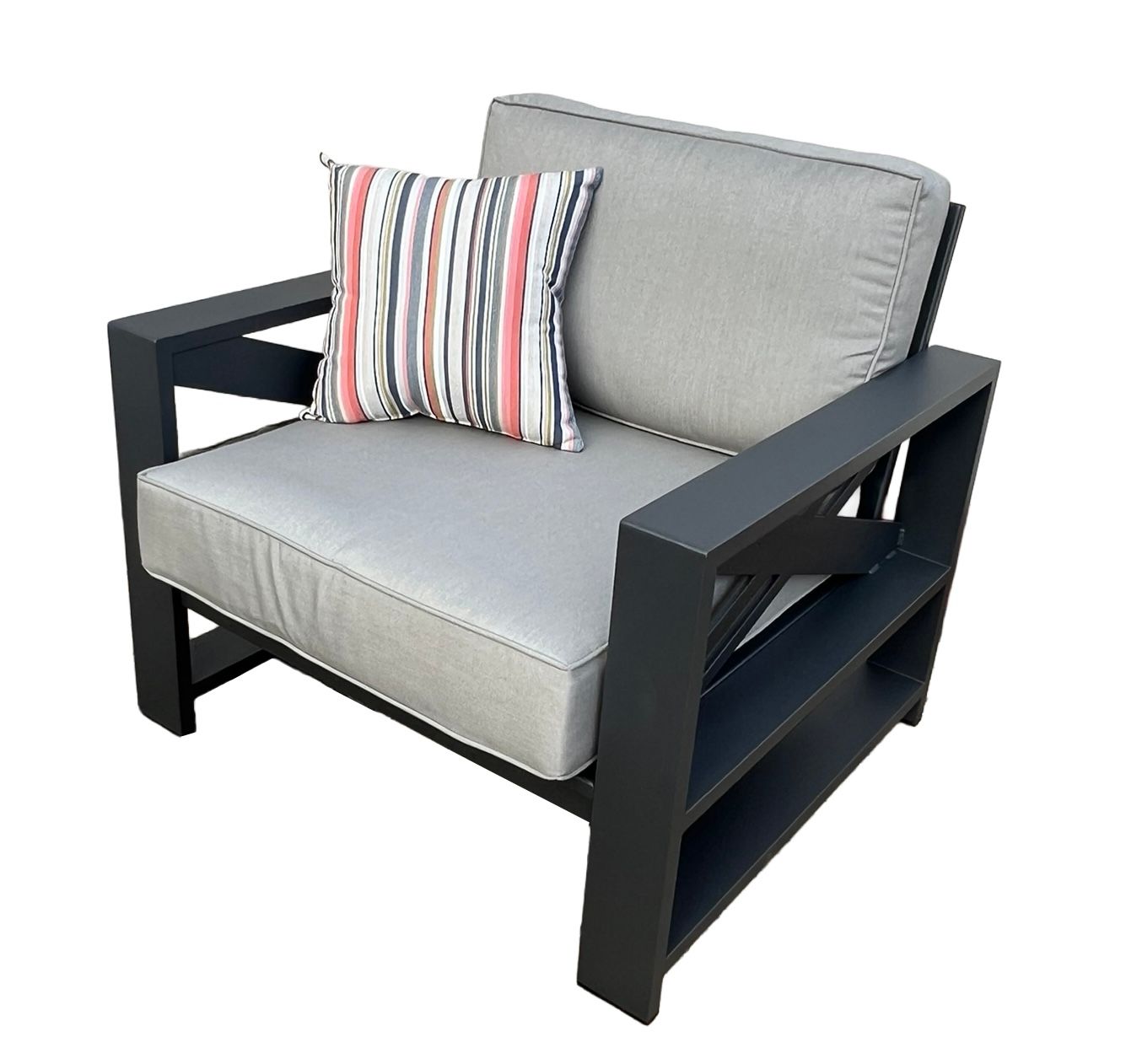 The beautiful modern set is a great addition to any outdoor space. Made of aluminum and feature wide arms for the ultimate comfort. Cushions included in your choice of Indoor / Outdoor fabrics. Sunbrella fabric available at an additional cost. Gray finish.