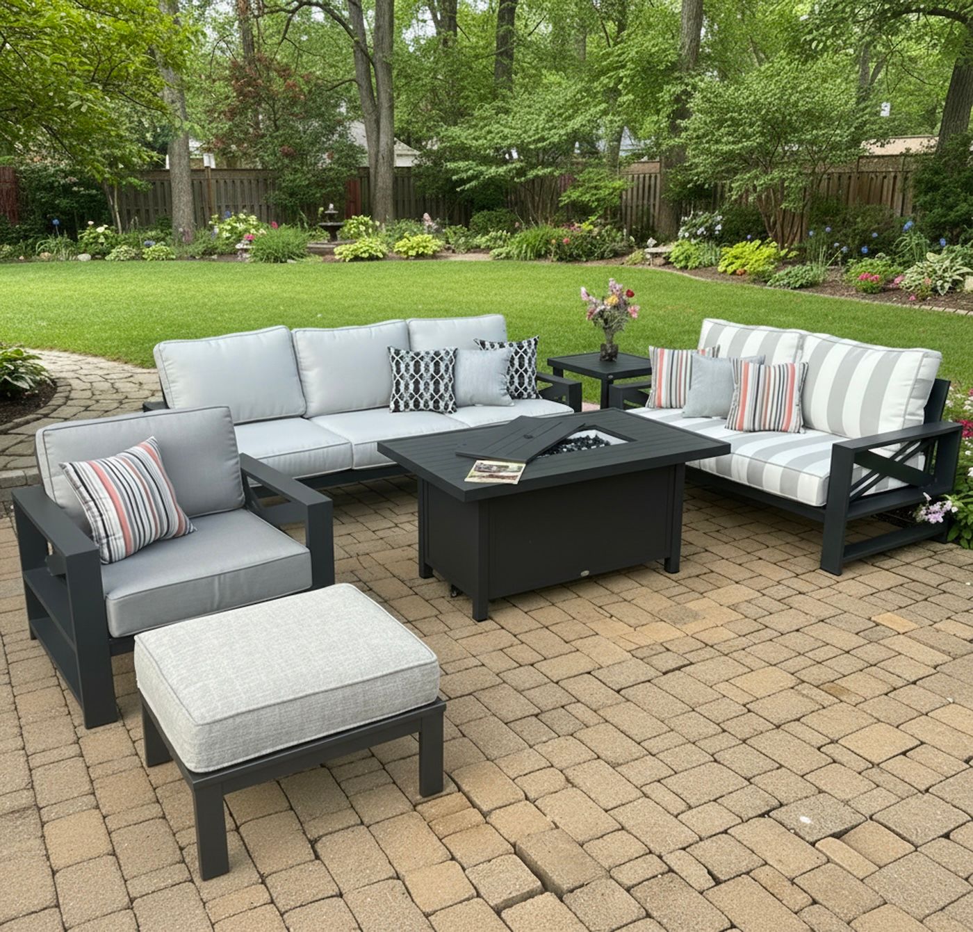 Set of Six includes: Sofa, Loveseat, Arm Chair, Firepit Coffee Table, End Table, Ottoman
