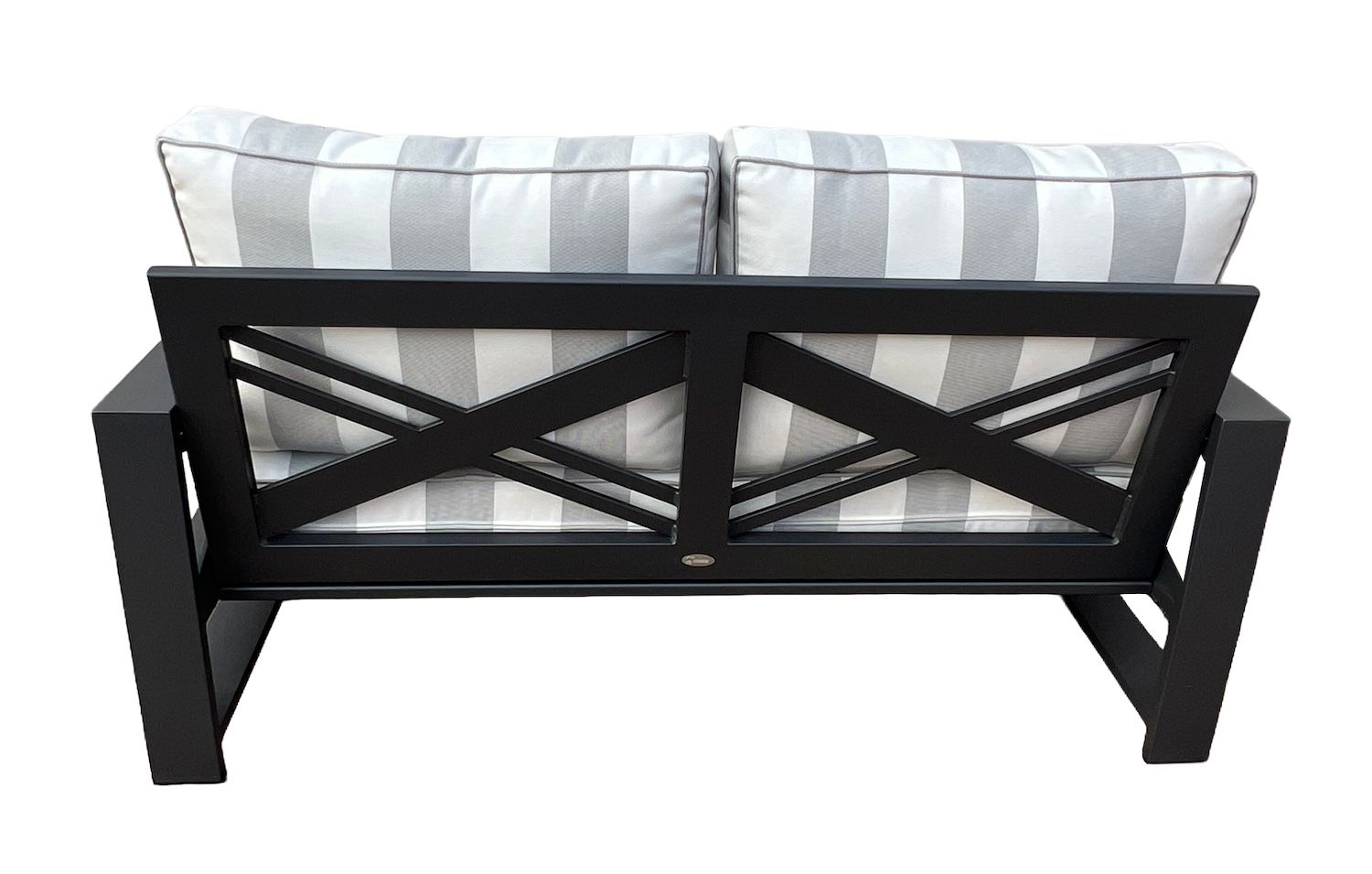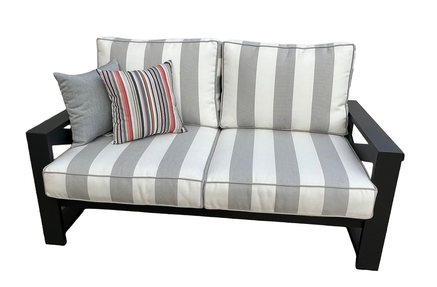 The beautiful modern set is a great addition to any outdoor space. Made of aluminum and feature wide arms for the ultimate comfort. Cushions included in your choice of Indoor / Outdoor fabrics. Sunbrella fabric available at an additional cost. Gray finish.