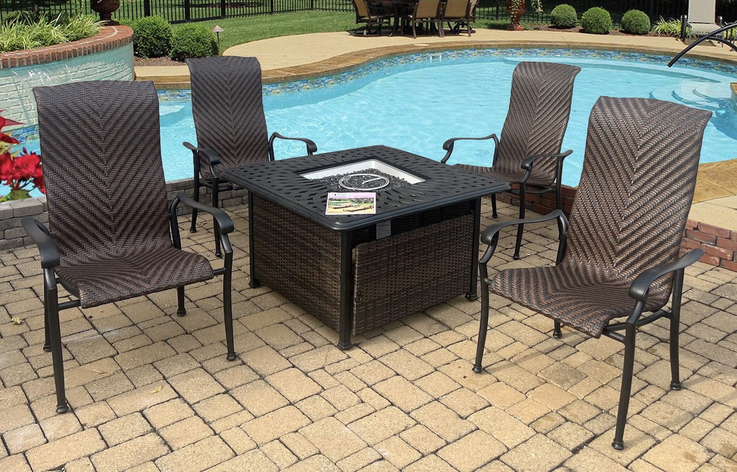 Set of Five includes: Square Firepit Table, 4 Arm Chairs