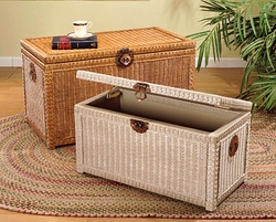 These hand-woven wicker trunks offer black iron handles and locks store linens, blankets, toys, and most household items. Each trunk is fully wood lined and includes a safety hinge to prevent the lid from slamming shut. Pecan or Whitewash finish.