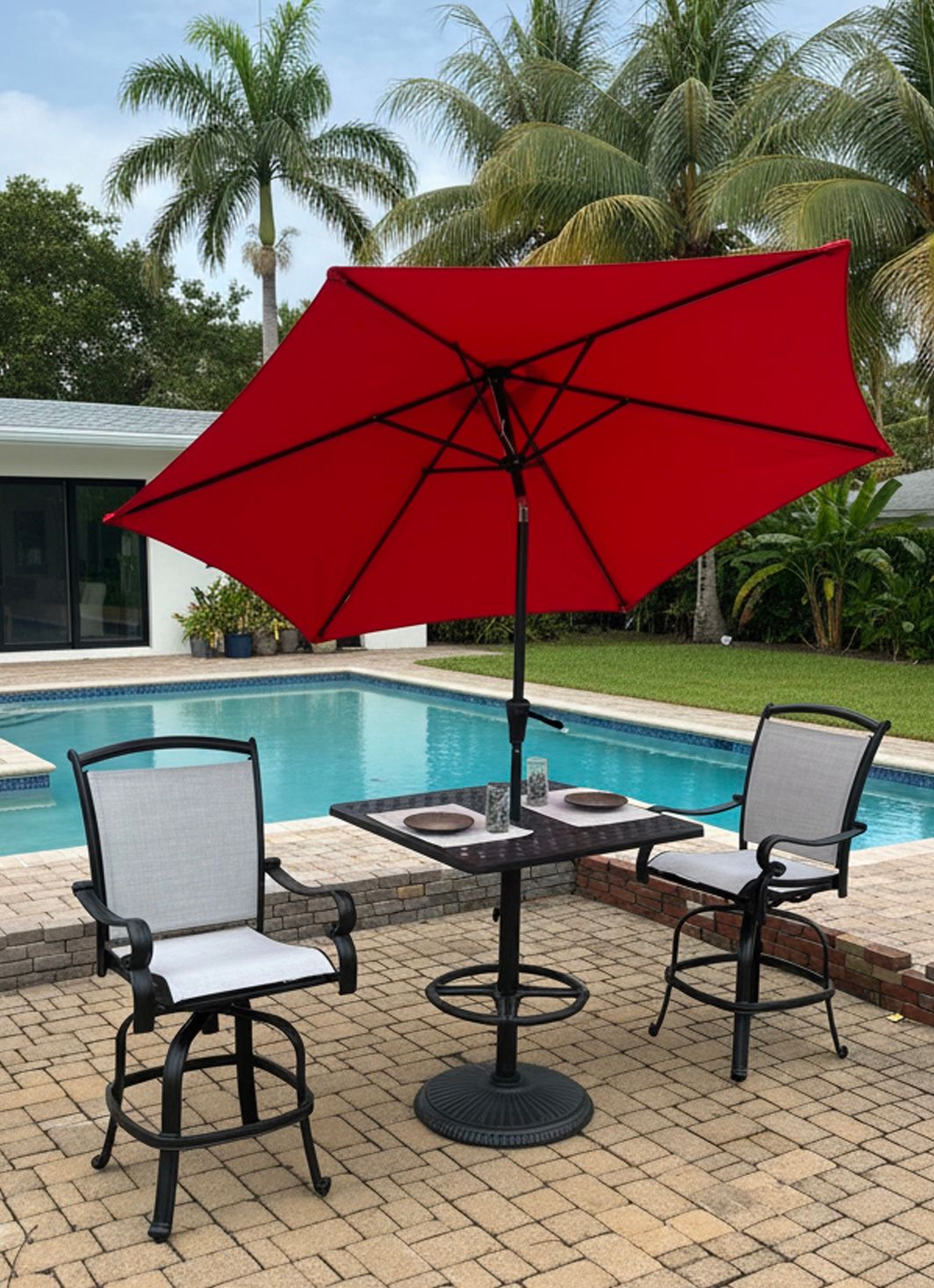 This stylish and comfortable cast aluminum and sling set is ideal for entertaining family and friends. Each stool swivels a full 360 degrees. The matching pub table is the ideal height for the stools and includes an umbrella hole.