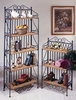 These decorative black finished wrought iron etageres have a spacious design that's perfect to hold large books, plants, and other hard-to-fit collectibles. Available in two sizes, with hand-woven shelves of natural honey finished wicker. Each shelf folds flat for easy storage and is reinforced with metal for added strength.