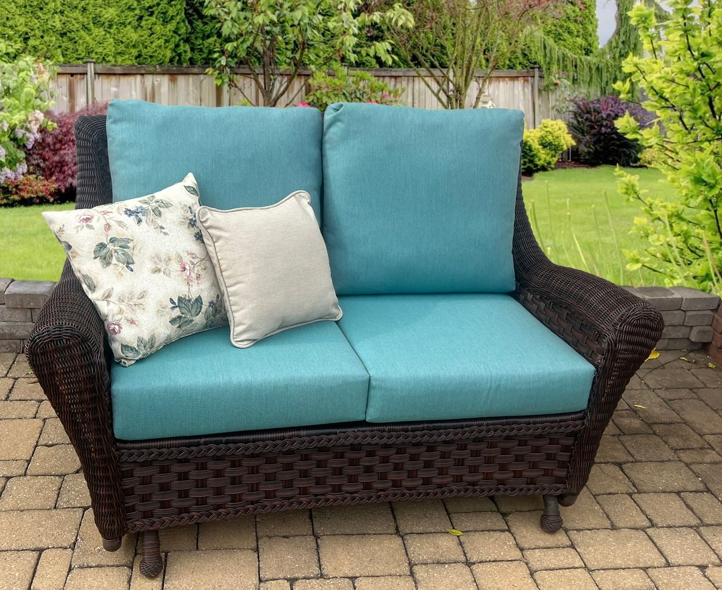 With their wide scrolled arms and plush cushions these gliders provide the comfort that you demand for fine outdoor entertaining. Each glider is constructed of handwoven vinyl/resin fibers over rustproof aluminum frames. The sturdy mechanisms glide effortlessly with the slightest push. Includes your choice of outdoor Acrylic fabric (resists water and mold). Sunbrella fabric available at an additional charge. Dark Cherry finish.