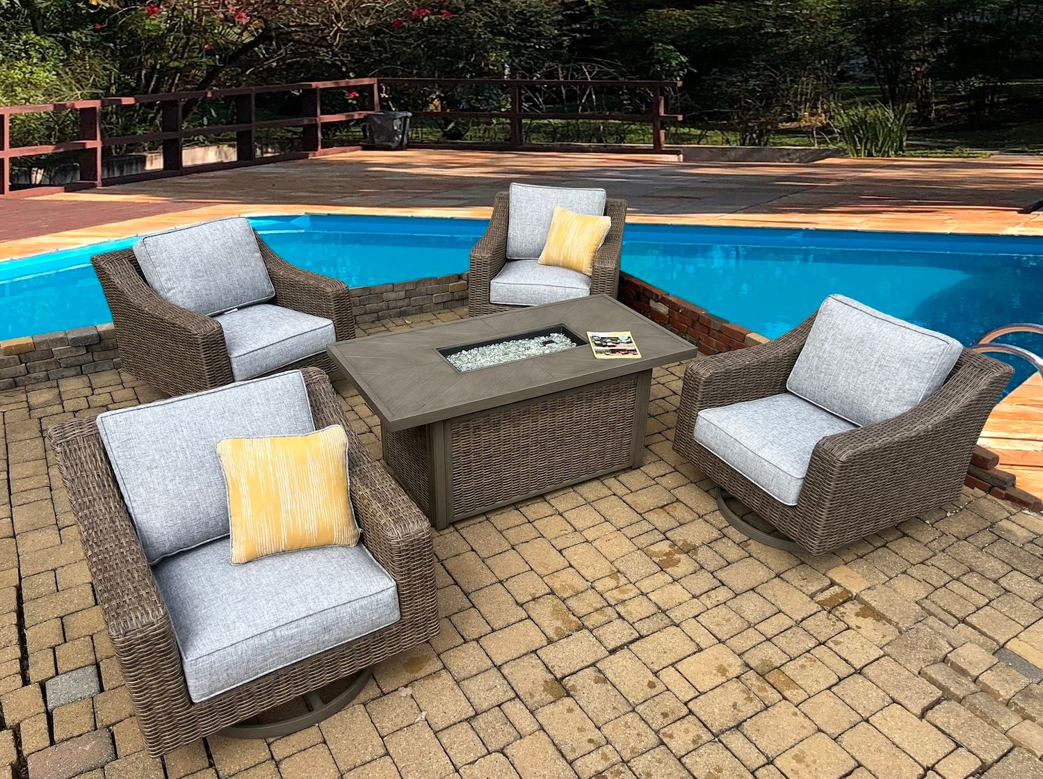 Set of Five includes: Firepit Table, 4 Swivel Chairs