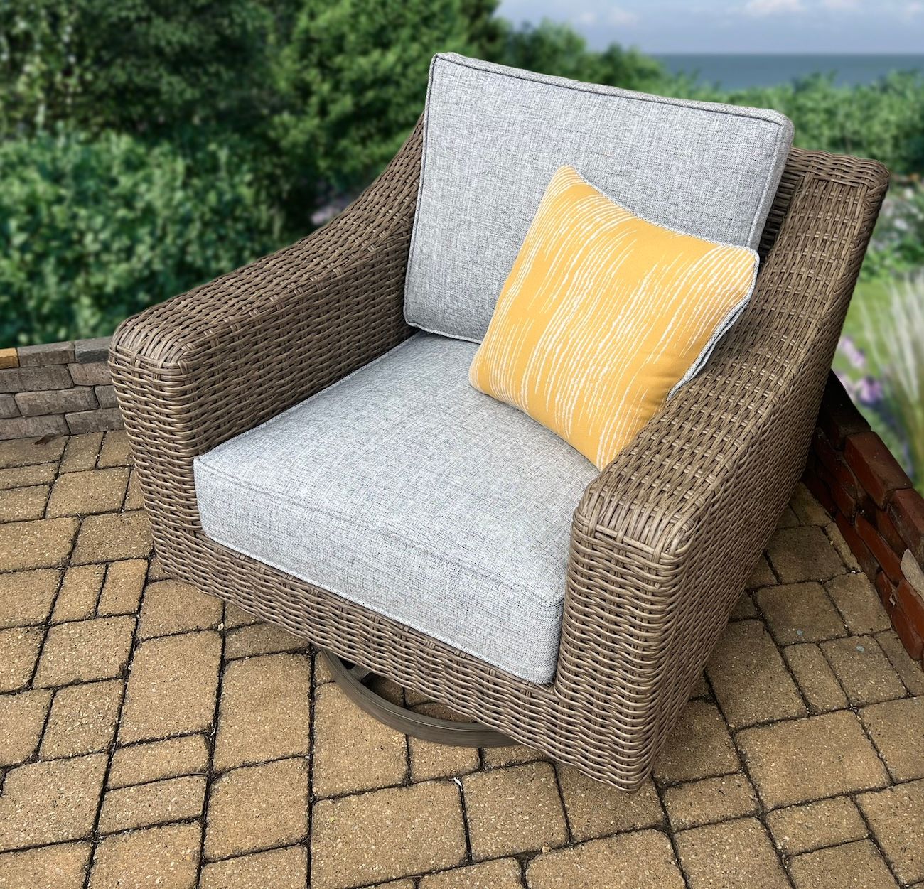 This elegant "All Weather" set is ideal for outdoor entertaining on your deck or patio. Each piece is handwoven over rustproof aluminum frames using a soft durable vinyl/resin material in a flat weave. The plush cushions and wide arms of this set invites you to sit back and relax. Enjoy a cozy atmosphere with the enclosed fire pit table. Cushions included in your choice of indoor/outdoor fabric. Sunbrella fabrics available for an additional charge.